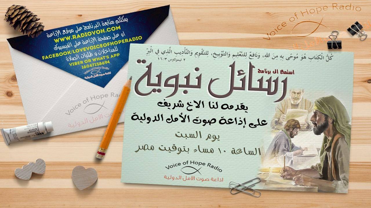 برنامج “رسائل نبوية” يقدمه لنا الاخ شريف على إذاعة صوت الأمل الدولية كل يوم سبت الساعة 10 مساء بتوقيت مصر, الثانية عشر ظهرا بتوقيت فانكوفر بكندا و كاليفورنيا بأمريكا, الثالثة بعد الظهر بتوقيت تورنتو و كيبيك بكندا, السادسة صباح الأحد بتوقيت سيدني بأستراليا.