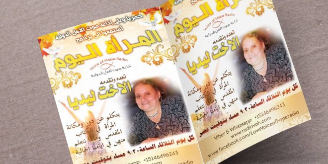 هل للمرأة تاثير ودور في المجتمع حسب الكتاب المقدس؟؟؟ هل دور المرأة كام له تاثير على المجتمع؟ كيف؟ للاجابة على هذه الاسئلة او اي اسئلة اخرى لديكم ولاي طلبات صلاة يمكنكم الاستماع على برنامج المراة اليوم تقدمه لنا الاخت ليديا النهارده الثلاثاء 12 يونيو في تمام الساعة8:30 مساء بتوقيت مصر …