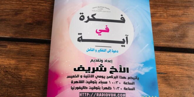 برنامج ” فكرة فى آية ” يقدمه لنا الاخ شريف على إذاعة صوت الأمل الدولية كل يوم إثنين وخميس الساعة 10:30 مساء بتوقيت مصر, 1:30 بعد الظهر بتوقيت فانكوفر بكندا و كاليفورنيا بأمريكا, 4:30 مساءا بتوقيت تورنتو و كيبيك بكندا, 7:30صباح اليوم التالى بتوقيت سيدني بأستراليا لمتابعة جميع الحلقات رجاء …