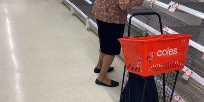 سيدة مسنة تقف أمام الأرفف الخاوية في أحد متاجر مدينة ملبورن. ونقلت وسائل الإعلام إنها كانت تبكي بعد أن جرد المتسوقون الأرفف من كل البضائع بسبب موجة الهلع التي تضرب البلاد خوفا من تفشي فيروس كورونا. يذكر أن أستراليا تنتج كل الأكل الذي تستهلكه بنفسها، بل أنها تنتج ما يكفي …