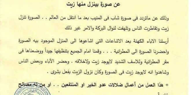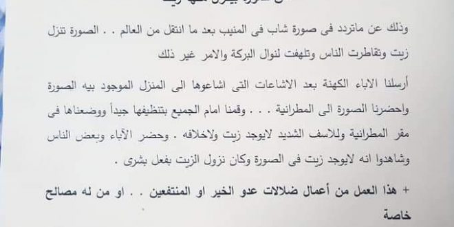 بخصوص الشاب اللي صورته بتنزل زيت? فعلا ? قَدْ هَلَكَ شَعْبِي مِنْ عَدَمِ الْمَعْرِفَةِ. لأَنَّكَ أَنْتَ رَفَضْتَ الْمَعْرِفَةَ أَرْفُضُكَ أَنَا حَتَّى لاَ تَكْهَنَ لِي.? ياريت ياجماعه بعد التقرير ده نرجع للمسيح بقى ونتعظ ونبطل مانمشي ورا اي خرفات وكلام تافه ملهوش اي اساس ونخلي رجاؤنا ف المسيح ومنثقش ف اي …