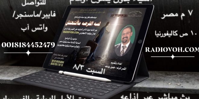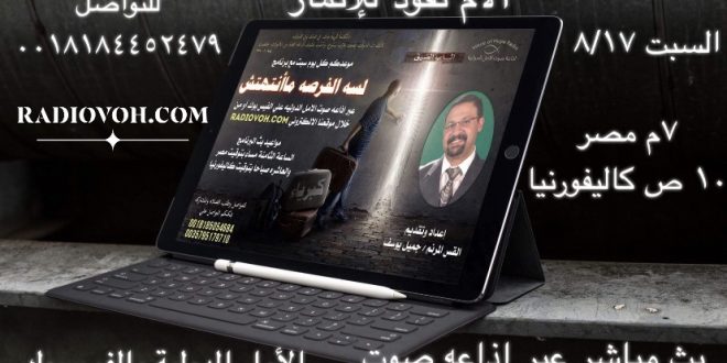 أكمل القراءة »فى الارتفاع : الحلقة الثالثة استمع الى برنامج “رسائل نبوية” يقدمه لنا الاخ شريف على إذاعة صوت الأمل الدولية الساعة 10 مساء بتوقيت مصر يمكنكم متابعة البرنامج على موقع الإذاعة www.radiovoh.com وعلى صفحة الاذاعة : https://www.facebook.com/LoveVoiceofhoperadio/ وعلى جروب الاذاعة : https://www.facebook.com/groups/125431344541707/ للمداخلات باسئلتكم و طلبات الصلاة عبر الماسنجر او Viber …