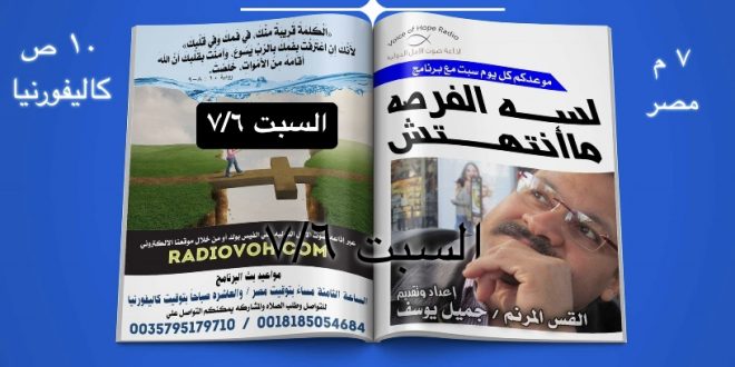 بـرنــامـــج الاقــتـــــراب إلى الله سـلـســلـــــة كـنــوز الـمـخــابــيء الـحــلـقـــــة (5) إلى مــاذا تُـشــيــر خـيـمــــة الاجـتـمــــاع ؟ مــا هـي الـمـعــانــي التي تـتـضـمـنـهــــا الـخـيـمـــة ؟ سـنـجــد بـنـعـمـــة الـرب الإجــابـــة وأكـثــــر على إذاعــة صــوت الأمــل الــدولــيـــة الاربعاء 19/6/ 2019 في الثامنة مساءً بـتـوقـيــت مـصـــر. الـبـرنــامــج من أعــداد وتـقـديــم قـس/ مـجــدي كــامـــل أرحب بالتعليقات والاستفسارات …