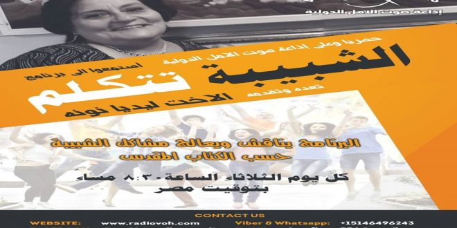 ماهي اقتراحات المستمعين لحل المشاكل بين الاهل والابناء؟ هل يستطيع الاهل اعطاء الابناء مسؤوليات؟ هل اعطاء حرية القرار للابناء تساعدهم ؟ لسماع الجواب على هذه الاسئلة واي سؤال اخر عندكم استمعوا الى برنامج : الشباب يتكلم برنامج بيناقش وبيعالج مشاكل الشباب حسب الكتاب المقدس تقدمه لنا الاخت ليديا نونه النهارده …