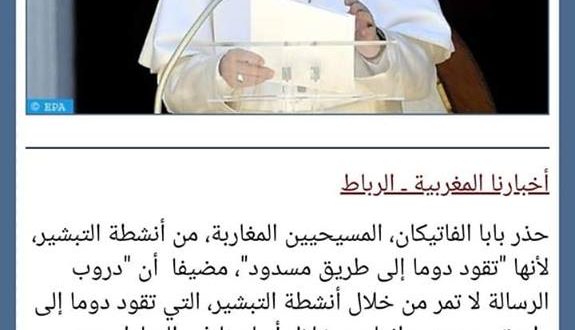رد علي ما قال بابا الفاتيكان، فرانسيس، أمام الطائفة الكاثوليكية الصغيرة في المغرب إن دور أفراد الطائفة في البلاد ليس محاولة جعل جيرانهم يعتنقون المسيحية، اريد ان ارد علي ما قال بابا الفاتيكان اولا التبشير ليس جرم وكأن التبشير وصمة عار , او تهمة شنعاء توجه لاي مسيحي , وان …