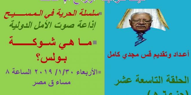 إذاعــة صــوت الأمــل الـدولـيـــة بــرنــامــج الاقــتـــراب إلى الله سـلـســلــة الـحــريــــة في الـمـســــــيـح “تابع” الـحـلـقـــة الـتــاسـعــــة عـشـــر (جـ6 د) إذا لم تكن شوكة بولس لا مرض، ولا زوجته، ولا علة في ظهره، أو مرض بعينيه، فما هي إذاً شـــوكـــــة بـولـس ؟ سيعطينا الرب عنها إجابات في حلقة الأربعاء 23/ 1/ 2019 …